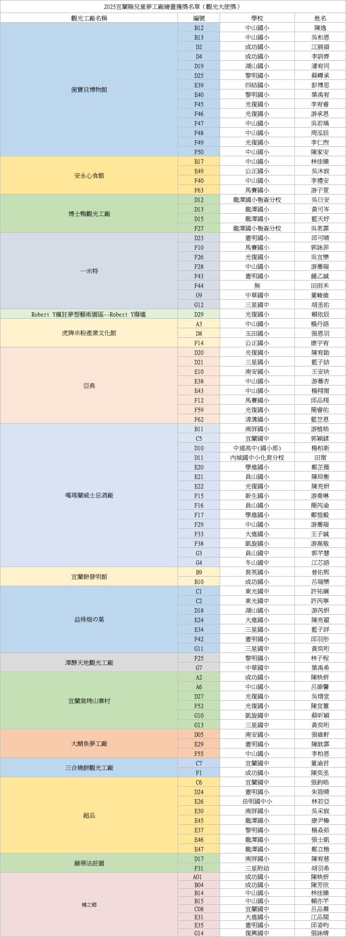 2025 | 兒童夢工廠獲獎名單 發佈時間 Aug 05, 2025 瀏覽次數 1400 ● 領獎事宜 (1)領獎時間:114年8月5日至114年11月5日。 (2)領獎地點:於得獎觀光工廠領獎。 ● 觀光大使獎-得獎名單 回最新消息